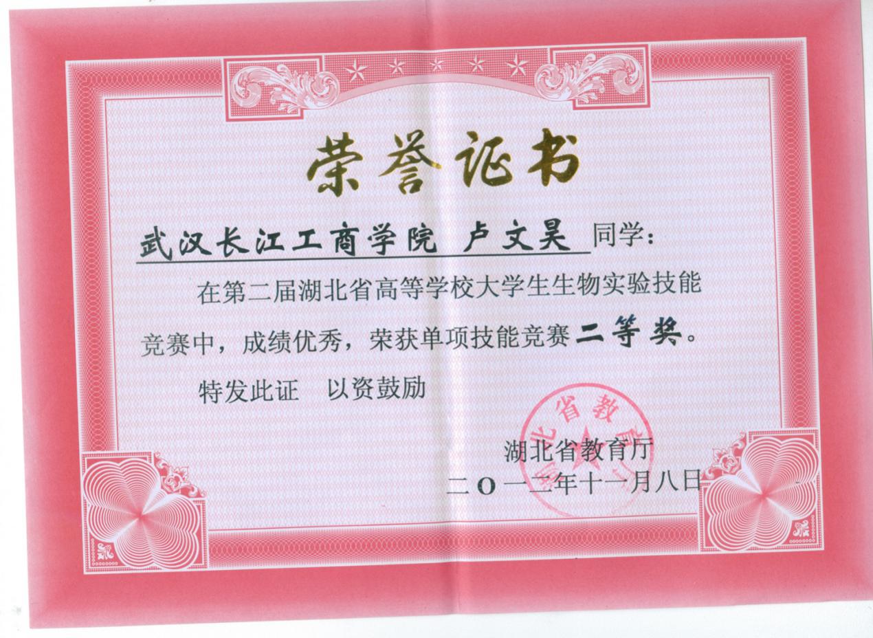 57 | 2012 | 卢文昊 | 第二届湖北省普通高校大学生生物技能竞赛 | 湖北省教育厅 | 二等奖 |