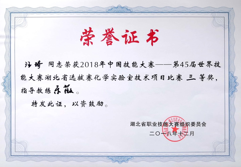 8 | 2018 | 汪琦 | 45届世界技能大赛湖北省选拔赛化学实验室技术项目大赛 | 湖北省人力资源和社会保障厅 | 三等奖 |