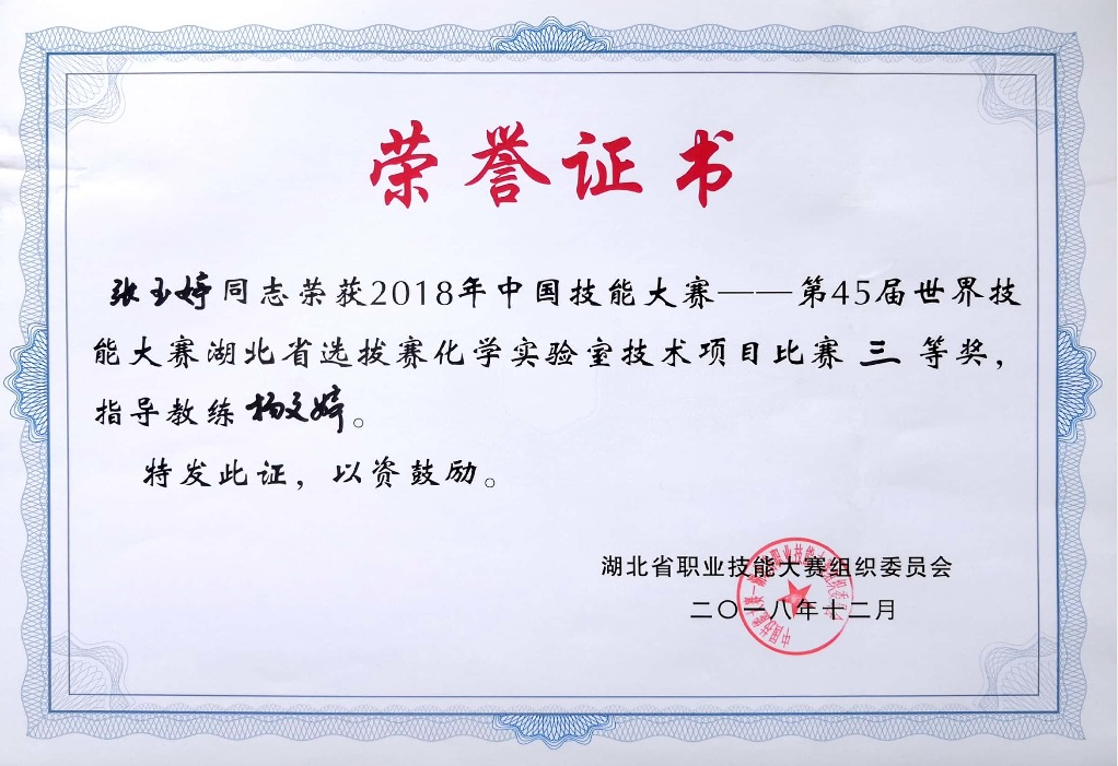 9 | 2018 | 张玉婷 | 45届世界技能大赛湖北省选拔赛化学实验室技术项目大赛 | 湖北省人力资源和社会保障厅 | |