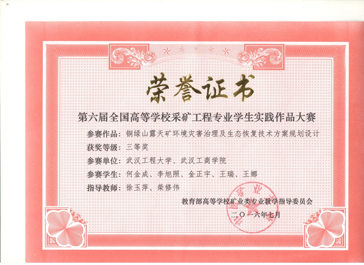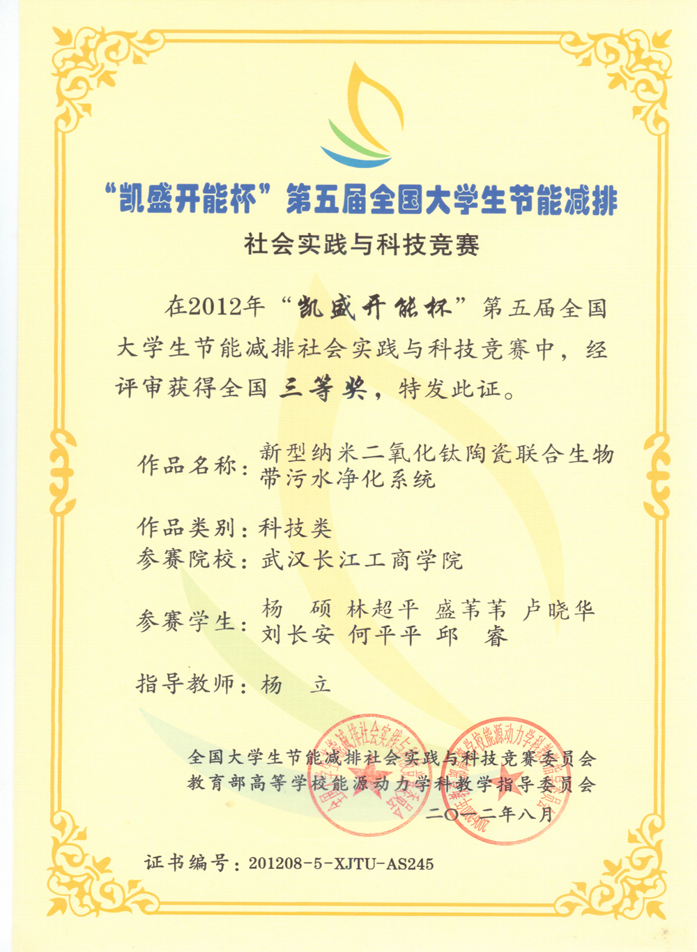 14 | 2017 | 锁进猛,叶亚娟,张肖生,杨超,杨升,张艺才,罗鑫宇 | 第十届全国大学生节能减排社会实践与科技竞赛 | 教育部高教司 | 三等奖 |