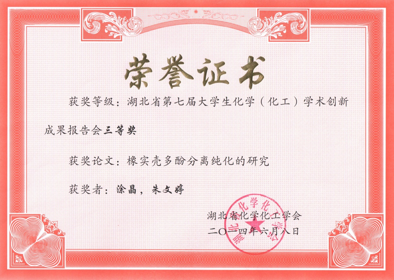 42 | 2014 | 涂晶 | 湖北省第七届大学生化学(化工)学术创新成果报告会 | 湖北省化学化工学会 | 三等奖 |
