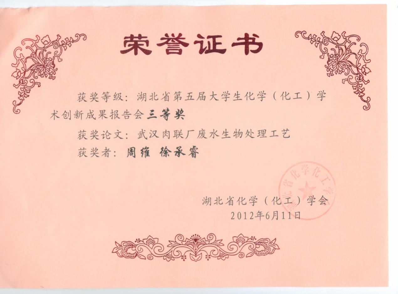 2012 | 周维 | 湖北省第五届大学生化学(化工)学术创新成果报告会 | 湖北省化学化工学会 | 三等奖 | |