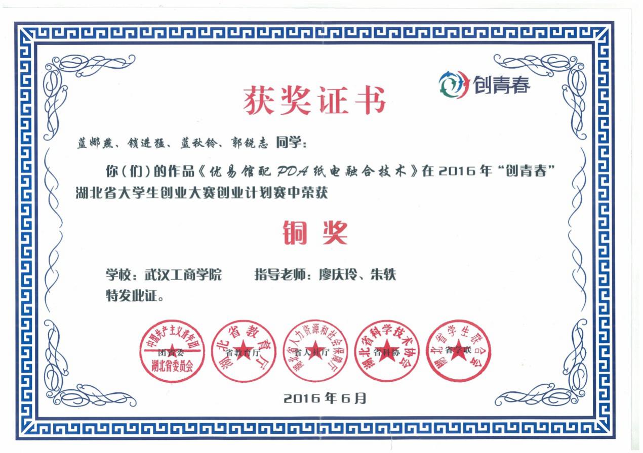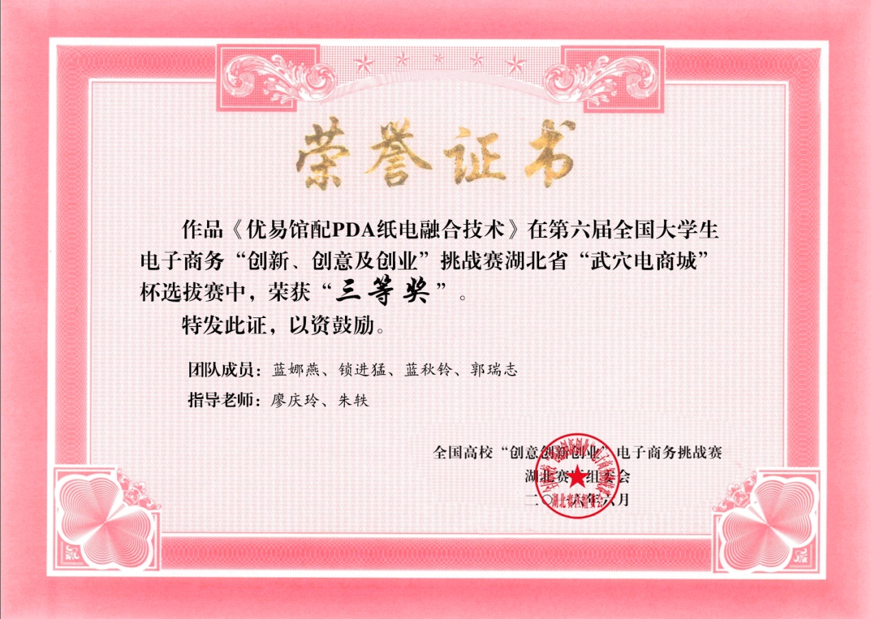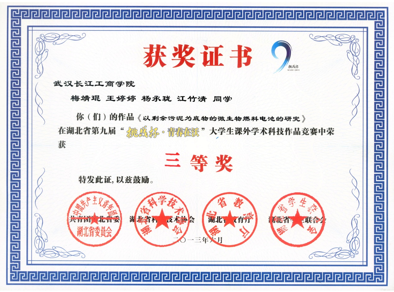 47 | 2013 | 梅靖琨 | 湖北省第九届“挑战杯·青春在沃”大学生课外学术科技作品竞赛 | 共青团湖北省委、湖北省教育厅、湖北省科学技术学会、湖北省学生联合会 | 三等奖 |