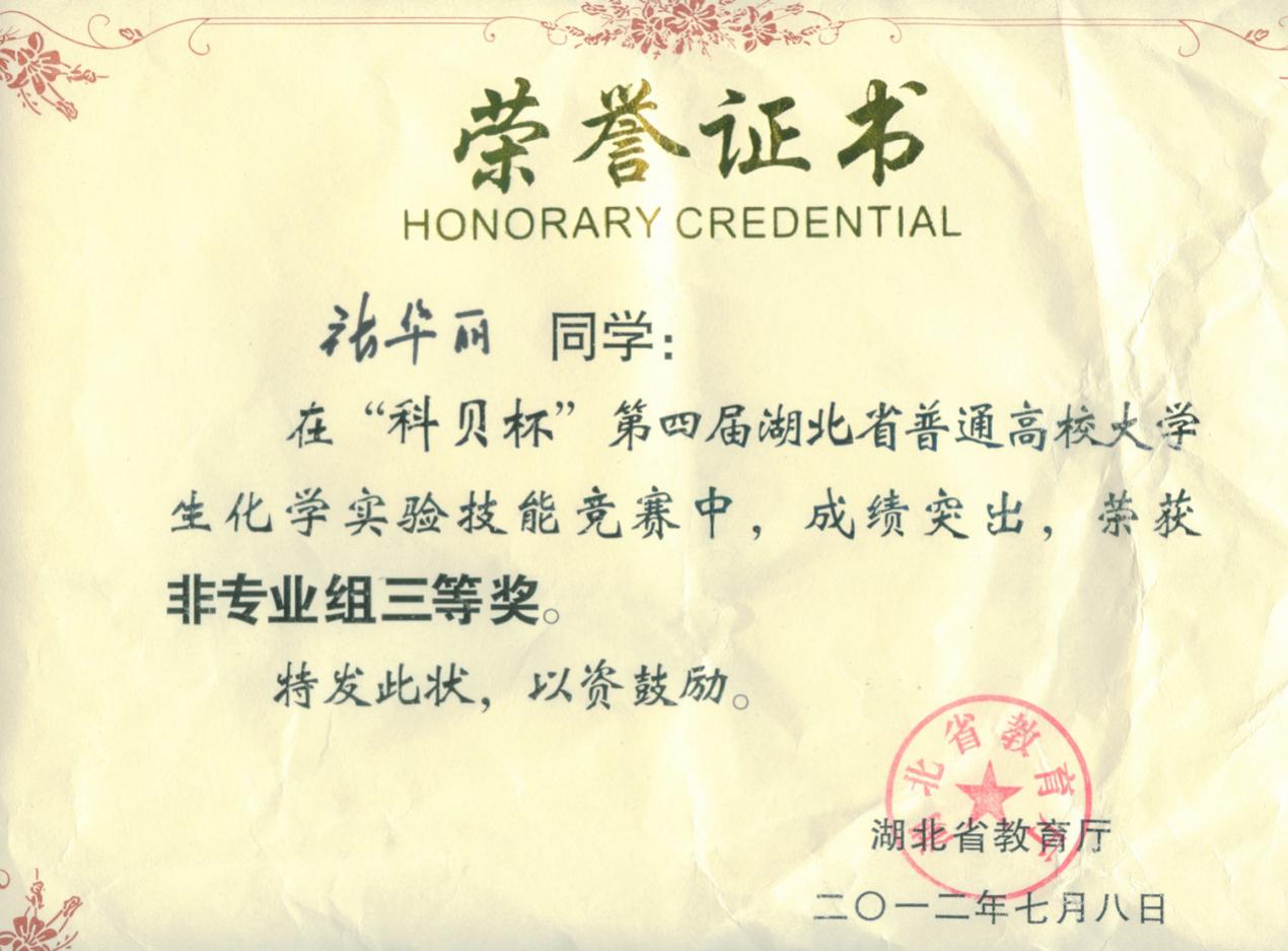 2012 | 张华丽 | 第四届湖北省普通高校大学生化学技能竞赛 | 湖北省教育厅 | 三等奖 | |