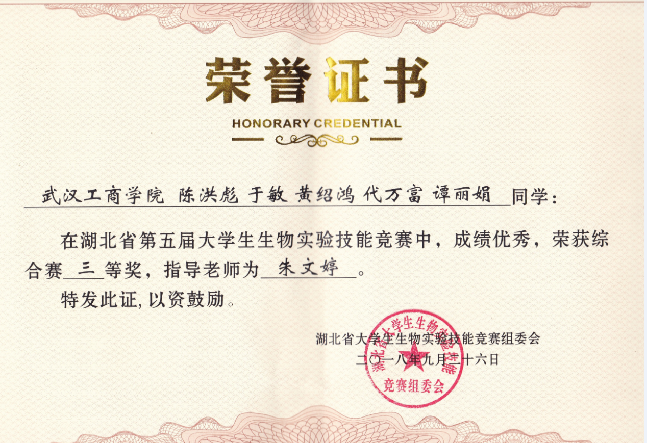 13 | 2018 | 陈洪彪,于敏,黄绍鸿,代万富,谭丽娟 | 第五届湖北省大学生生物实验技能竞赛综合赛 | 湖北省教育厅 | 三等奖 |