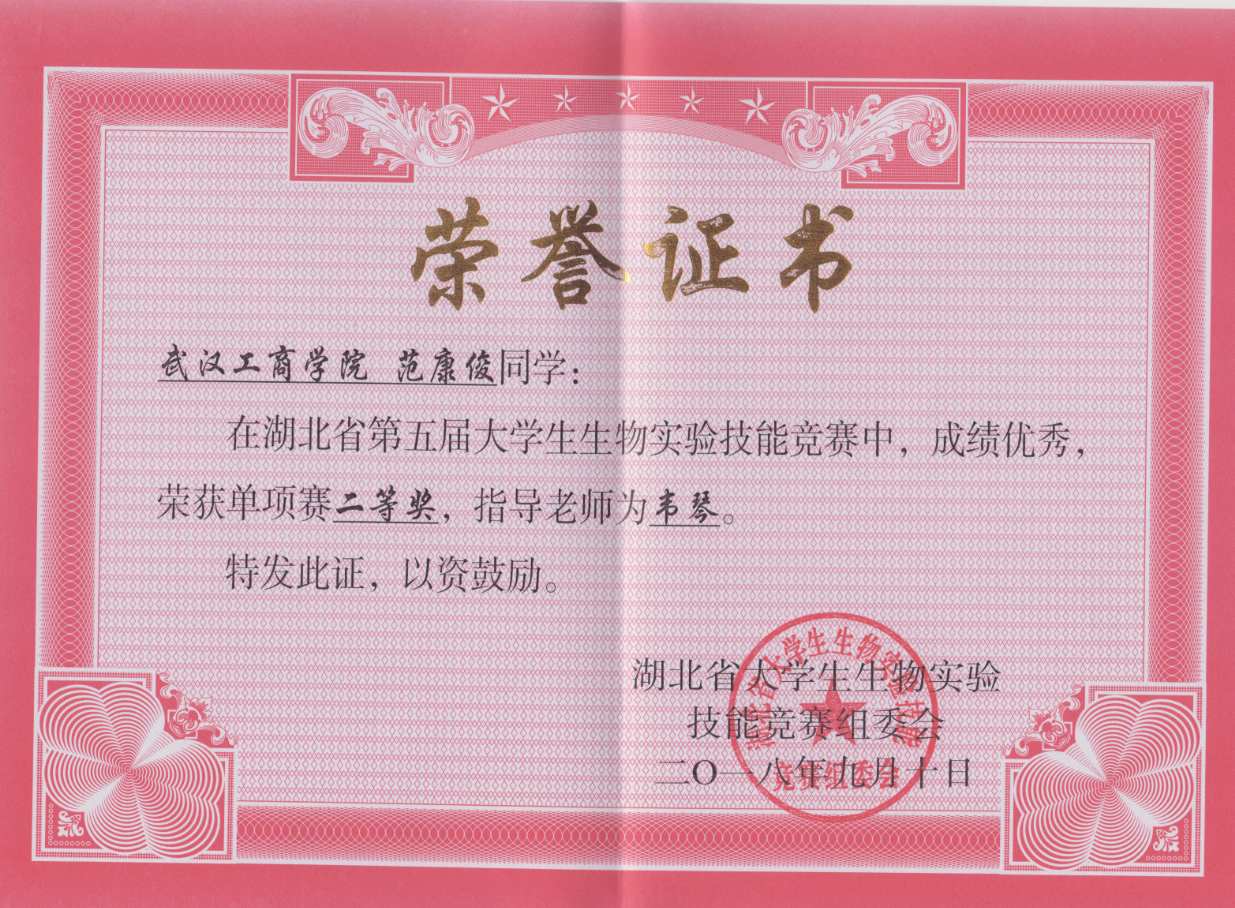 11 | 2018 | 范康俊 | 第五届湖北省大学生生物实验技能竞赛单项赛 | 湖北省教育厅 | 二等奖 |