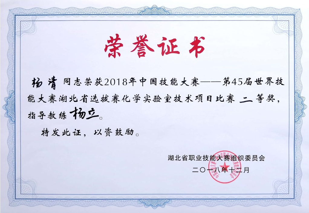 4 | 2018 | 杨清 | 45届世界技能大赛湖北省选拔赛化学实验室技术项目大赛 | 湖北省人力资源和社会保障厅 | 二等奖 |