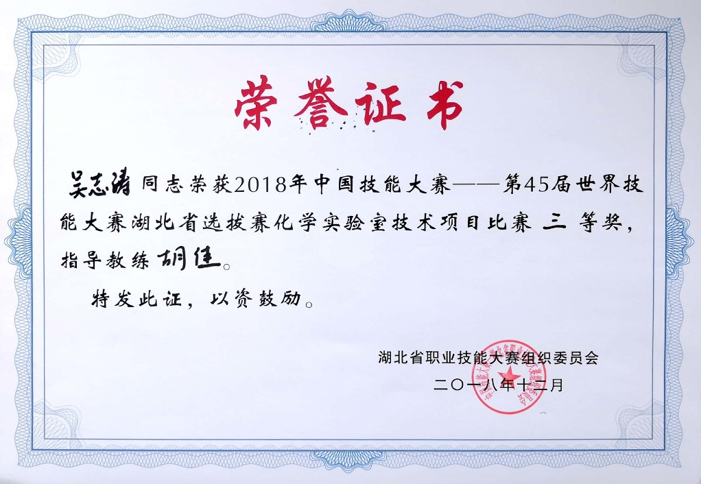 7 | 2018 | 吴志涛 | 45届世界技能大赛湖北省选拔赛化学实验室技术项目大赛 | 湖北省人力资源和社会保障厅 | 三等奖 |
