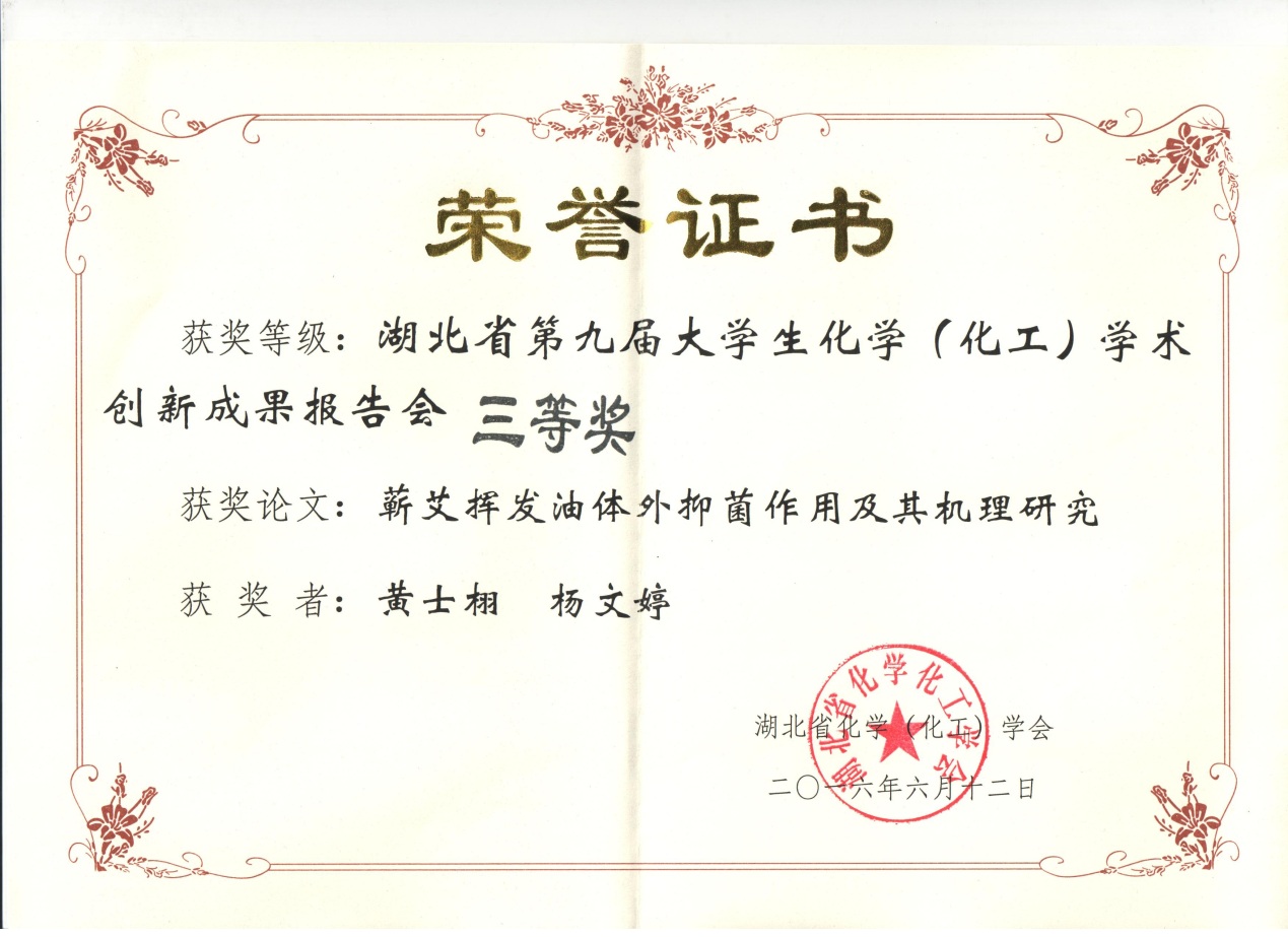 24 | 2016 | 黄士栩 | 湖北省第九届大学生化学(化工)学术创新成果报告会 | 湖北省化学化工学会 | 三等奖 |