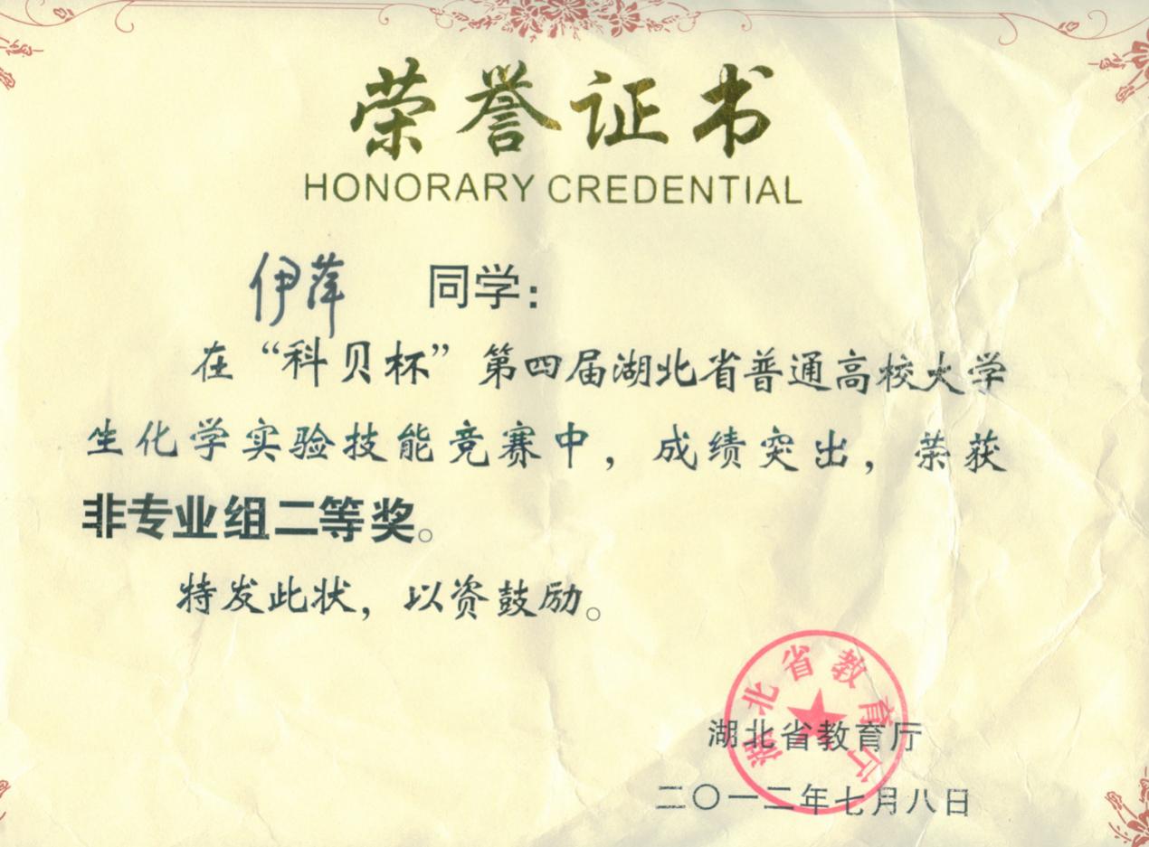 58 | 2012 | 伊萍 | 第四届湖北省普通高校大学生化学技能竞赛 | 湖北省教育厅 | 二等奖 |