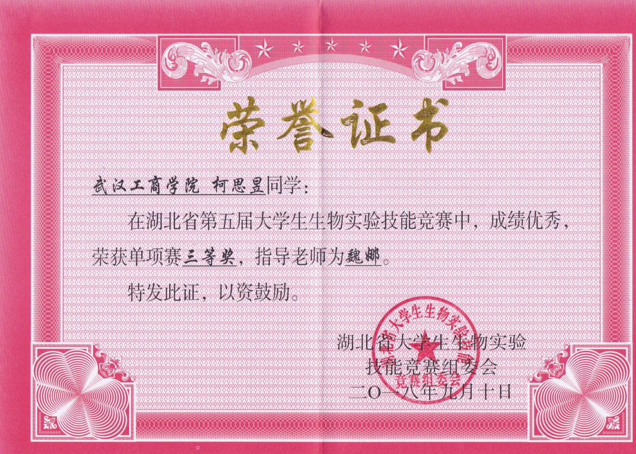 12 | 2018 | 柯思昱 | 第五届湖北省大学生生物实验技能竞赛单项赛 | 湖北省教育厅 | 三等奖 |