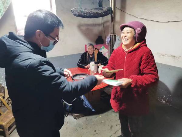 据悉,2022年12月,湖北省新型冠状病毒感染肺炎疫情防控指挥部办公室发布了《关于组织开展关爱重点人群“敲门行动”的通知》,bat365平台官网驻村工作队积极响应通知精神,切实帮助村民解决疫情防控的实际困难,于12月29日在全村范围内开展关爱重点人群的“敲门行动”,为农村特困供养户、低保户、脱贫不稳定户、边缘易致贫户、突发严重困难户送上了包含解热镇痛药、感冒类中药、口罩等在内的“健康爱心包”,做到不漏一户解决其就医用药困难,提供疾病预防服务。除此之外,学校还为他们送上了新年慰问金,帮助他们缓解生活上暂时遇到的困难。此举受到广大村民的广泛赞誉。边缘易致贫户冯大娘一只手拿着“健康爱心包”,一只手拿着新年慰问金,脸上露出了久违的笑容,她高兴地说:“年龄大了,身体也不蛮好,一直很担心没有退烧药,好在你们及时送来了!”
