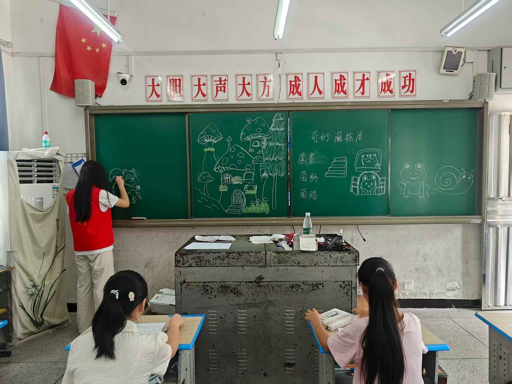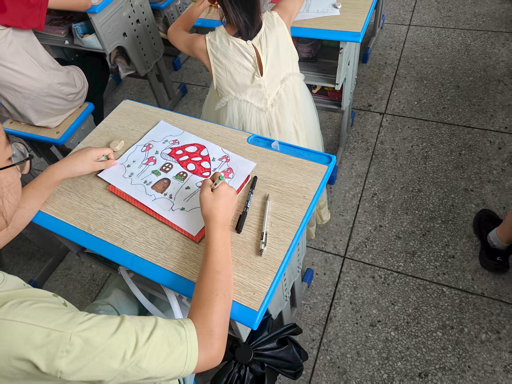 在爱心托管二班,由吴君茹老师和石斐然助教给大家带来绘画课。志愿者们与小朋友们围坐在一起,开展了一堂以绘画为主题的欢乐课堂。课堂上,志愿者们先是耐心讲解了简单的色彩搭配小技巧,用生动的比喻告诉孩子们“红色像小太阳一样热情,蓝色像小溪水一样清凉”;接着引导大家发挥想象,有的小朋友画了奇妙蘑菇屋,志愿者们向小朋友们讲述了蘑菇屋的构造与屋子结合在一起,然后小朋友们自由发挥,志愿者们则在一旁温柔地帮他们调整画笔角度,时不时为特别的创意鼓掌。