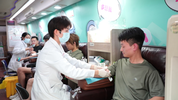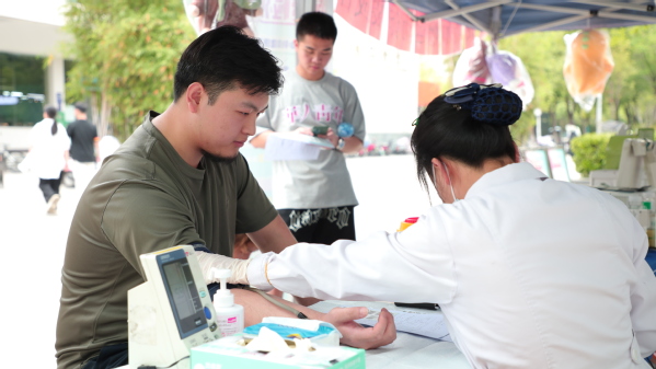 现场气氛热烈,献血队伍中,7名来自学校国旗护卫队成员的身影格外引人注目。“这是我送给自己的青年节礼物!作为学校国旗护卫队的一员,守护国旗是我们的荣誉和责任,献血也是一种责任和奉献。新时代大学生不仅要努力学习专业知识和技能,还应该主动肩负社会责任。伸出手臂献出热血,便是我对‘强国有我’誓言的朴实践行。”学校电子商务专业2024级学生薛立伟笑着说,“虽然这是我第一次献血,但整个过程蛮顺利。医护人员很专业,志愿者服务贴心,一直非常关注我的感受。”