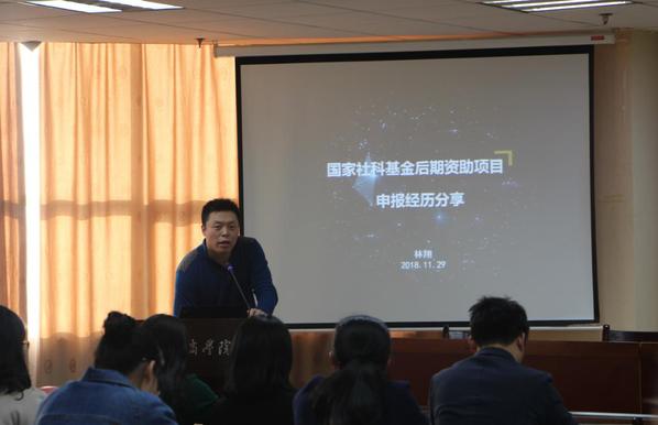 林翔副教授从政策解读、申报心得、结项流程等几个方面分享了自己申报国家社科基金后期资助项目的经验,对后期项目与一般项目申报的难度进行了对比分析。他指出,后期资助项目申报与一般(重点)资助项目最大的区别在于,后期资助需要提交80%的已完成的科研成果(未公开发表),所以需要申报者平时注重对研究内容、成果的积累和沉淀。