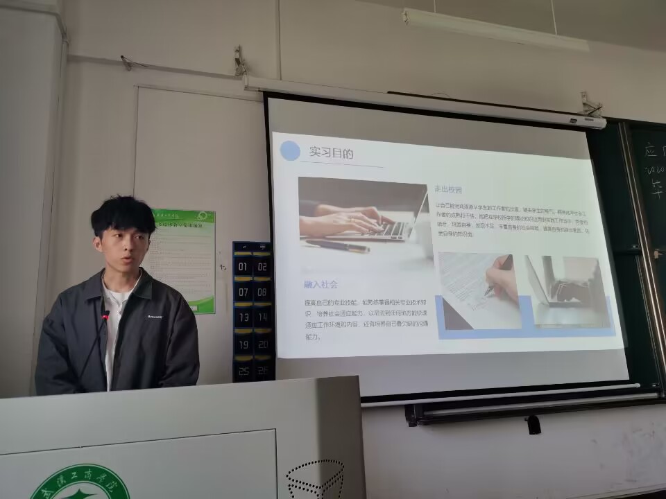 答辩开始,同学们一一上台展示。答辩讲台上,每位同学轮流上台总结自己6个月的实习工作,将自己在实习期间的工作情况、所遇到的问题、实习报告的撰写以及对实习单位、学校的建设性意见进行了详细的阐述,流畅的演讲呈现出同学们对实习的深刻认识。