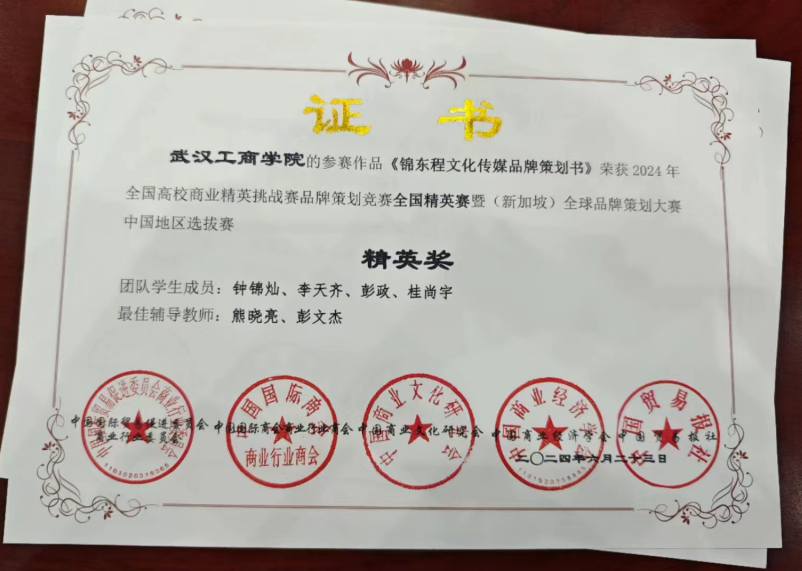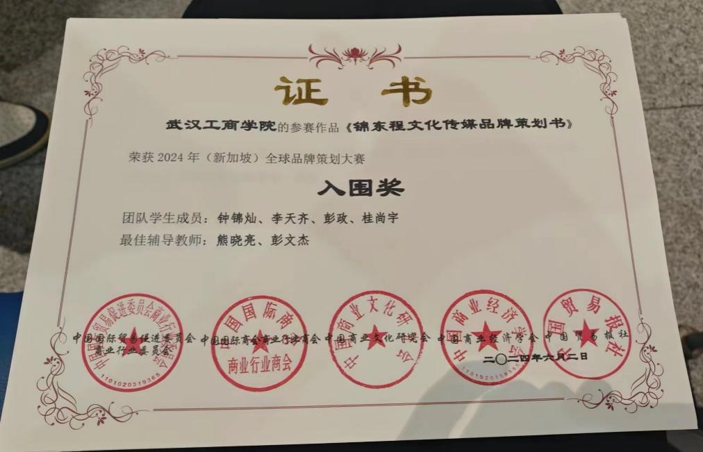 应用技术学院22级电子商务钟锦灿、李天齐、桂尚宇、彭政在指导老师熊晓亮、彭文杰的带领下取得新突破;参赛作品《锦东程文化传媒品牌策划书》荣获全国精英奖、国赛一等奖,展洽交流展示全国二等奖!并成功入围2024(新加坡)全球营销策划总决赛。bat365平台官网也被赛会授予最佳组织奖。