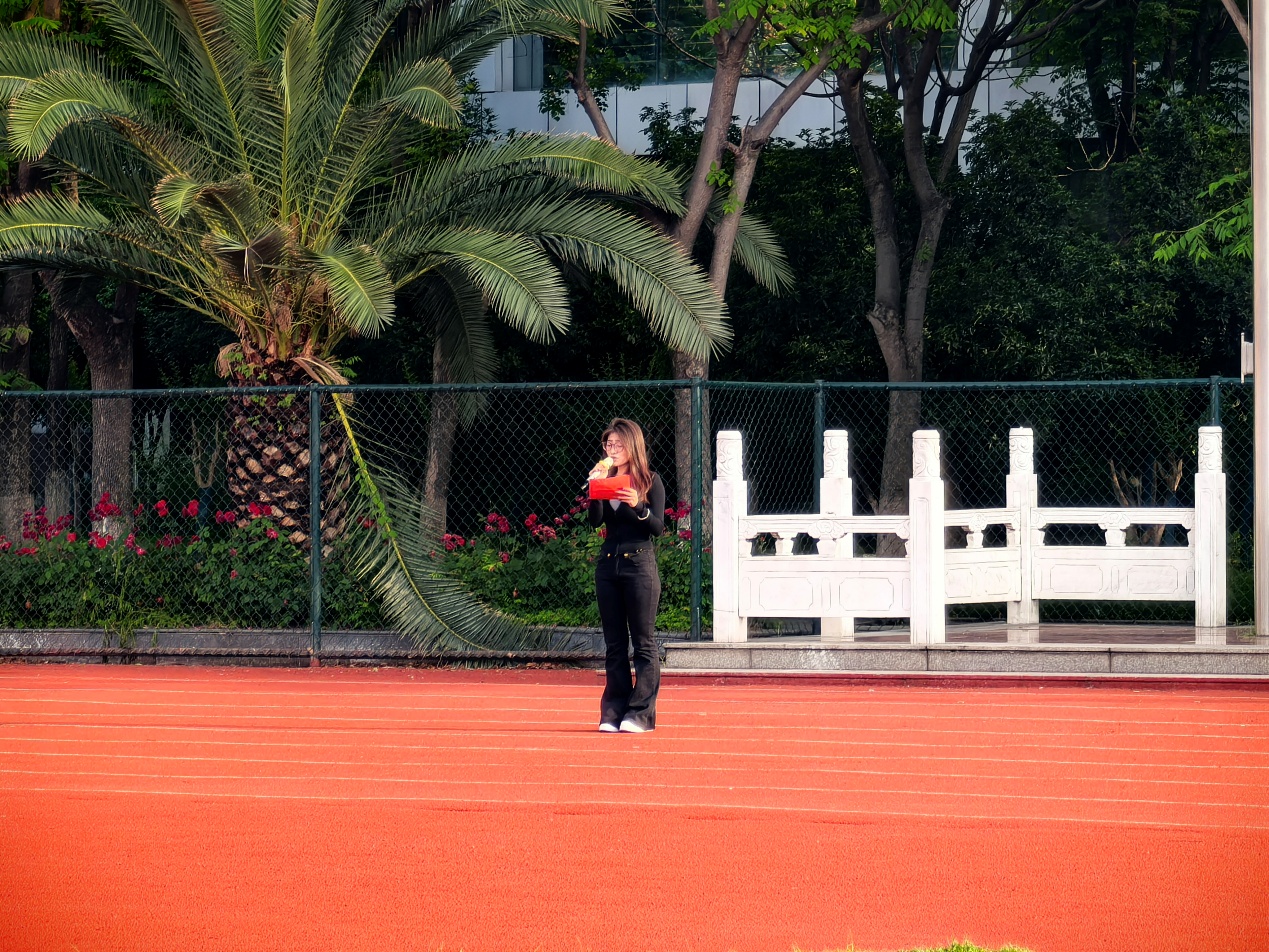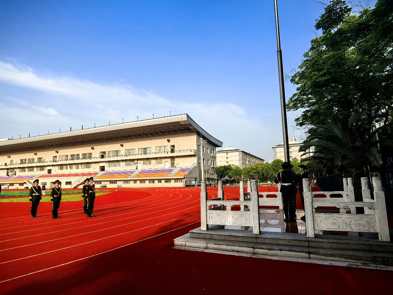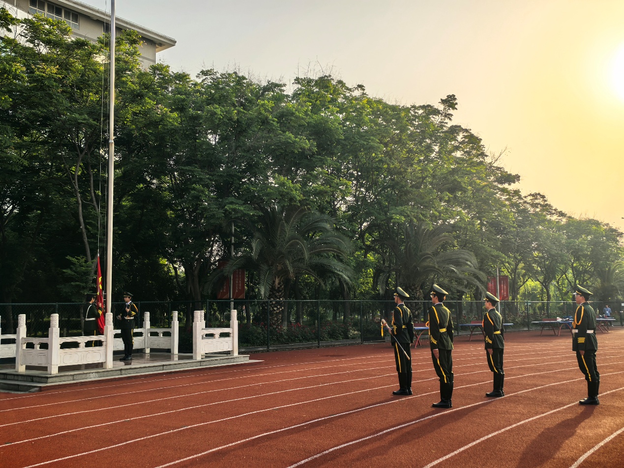 应用技术学院国旗护卫队的队员们身着笔挺礼宾服,肩披金色绶带,步伐铿锵、目光如炬,于操场中央列队待命,运动场上的晨雾尚未散尽,队员们步履铿锵如五四先驱的呐喊回响。朝阳跃出地平线,金色光芒与鲜红旗帜交相辉映,我们的目光仅仅追随着那飘扬的五星红旗。全场师生肃立行注目礼,铿锵歌声响彻云霄。百年前,青年学子为民族觉醒振臂高呼;百年后,我们以护卫国旗的方式接续荣光!